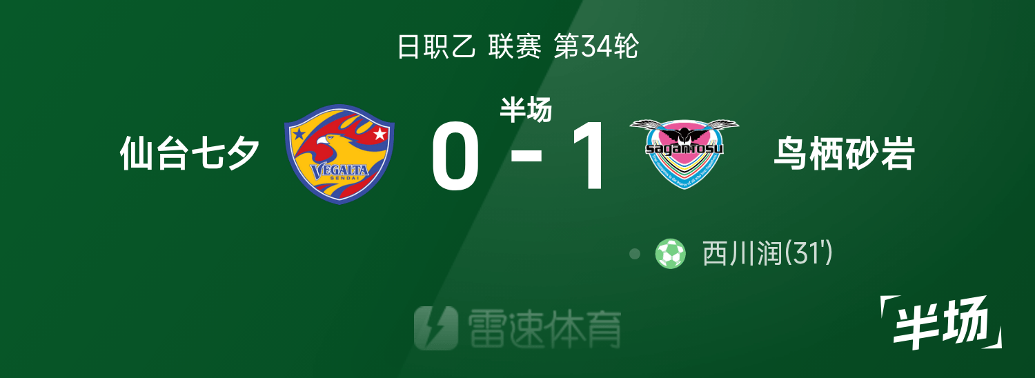 日职乙半场:西川润点射建功,鸟栖砂岩暂1-0仙台七夕