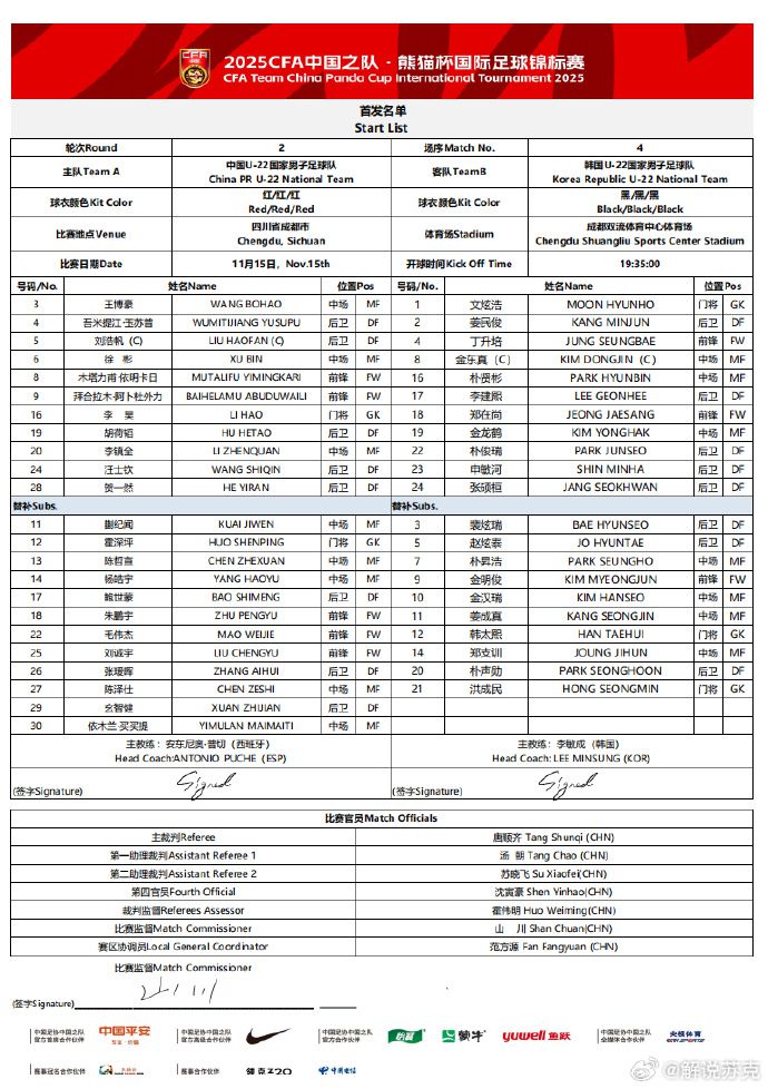 6686体育11月15日讯 北京时间今日,熊猫杯第二轮,国足U22对阵韩国U22,赛前双方公布首发。