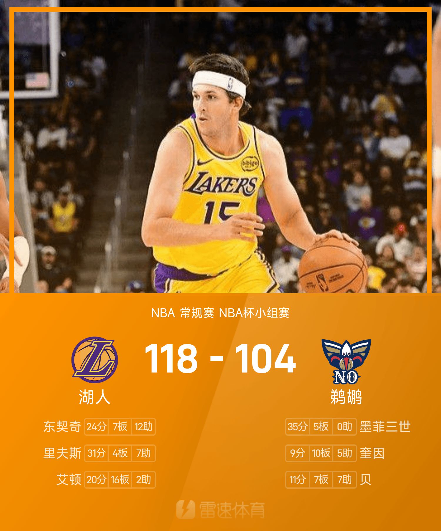 里弗斯高效砍下31分4抢篮板7助攻助湖人取胜,墨菲三世35分难救主。