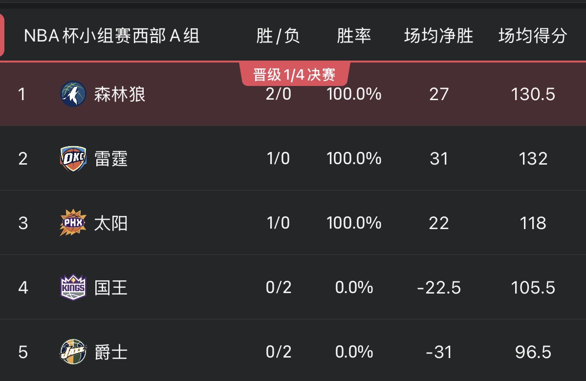 西部A组这边,森林狼强势取得2胜0负的战绩,净胜分则是高达+54,目前占据出线的有利形势,而他们之后与太阳以及雷霆的两场竞赛将会决定本组的出线名额归属。