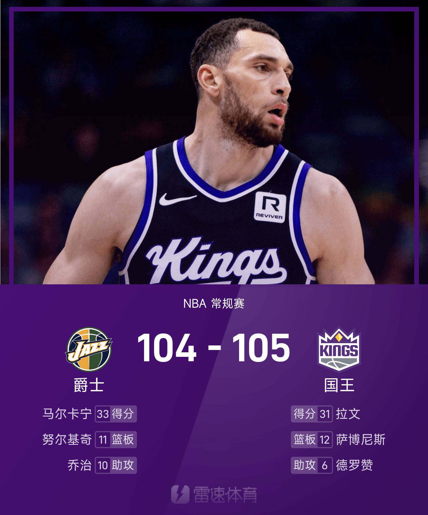 6686体育10月25日讯 25/26赛季NBA 常规赛,国王对阵爵士。双方全场战罢,国王105-104战胜爵士。拉文得到31分2板1助率队取胜,马尔卡宁空砍全场最高的33分4板1助。
