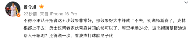 不得不承认开拓者这五小效果非常好,那效果好大五号位就上不去,别说杨瀚森了,克林根都上不去!勇士这帮老家伙背靠背顶的够可以了,库里半场24分,波杰姆斯基、穆迪这帮人干嘛呢?还得说一次,看波杰打球脑瓜子疼