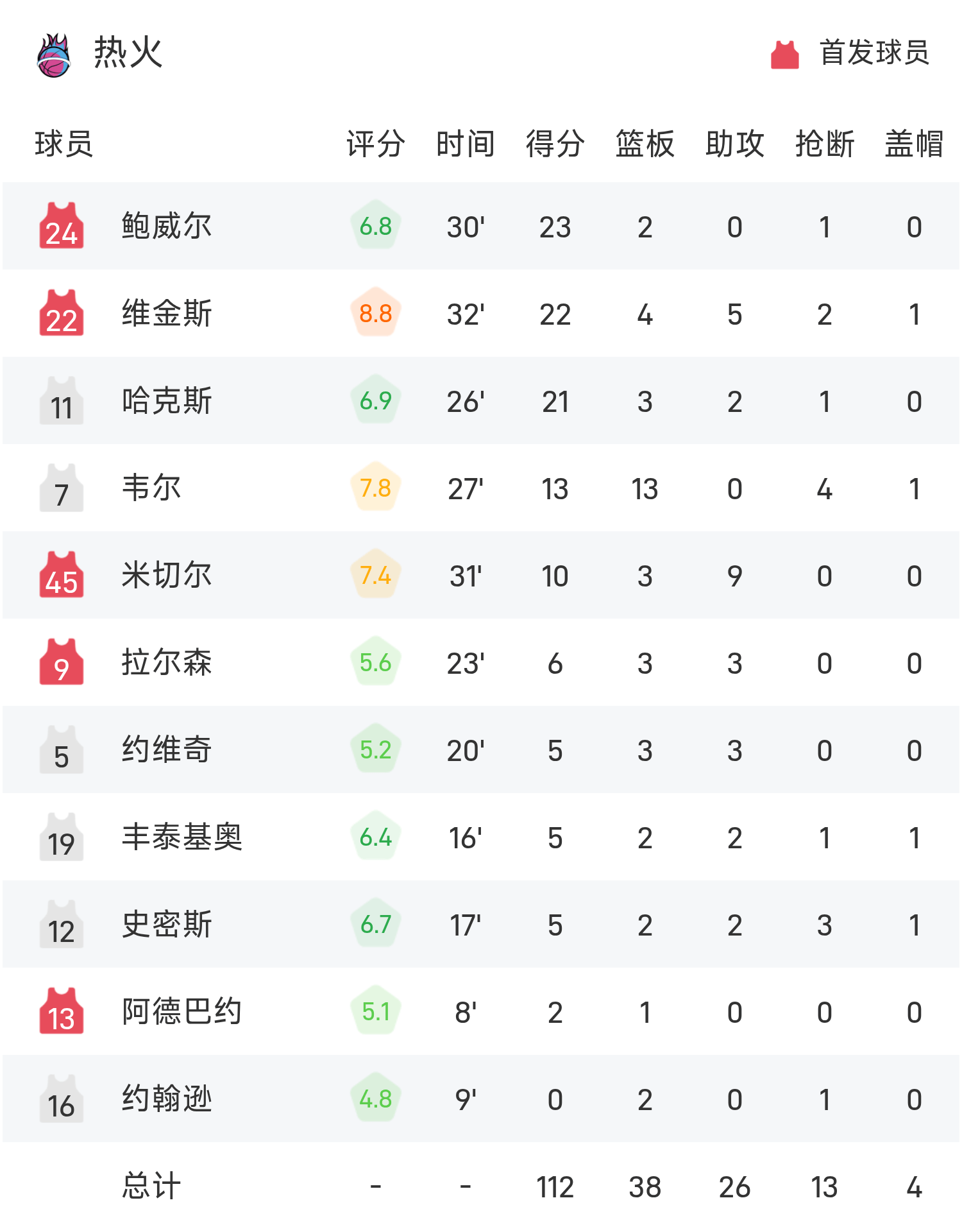 双方全场战罢,掘金122-112战胜热火。