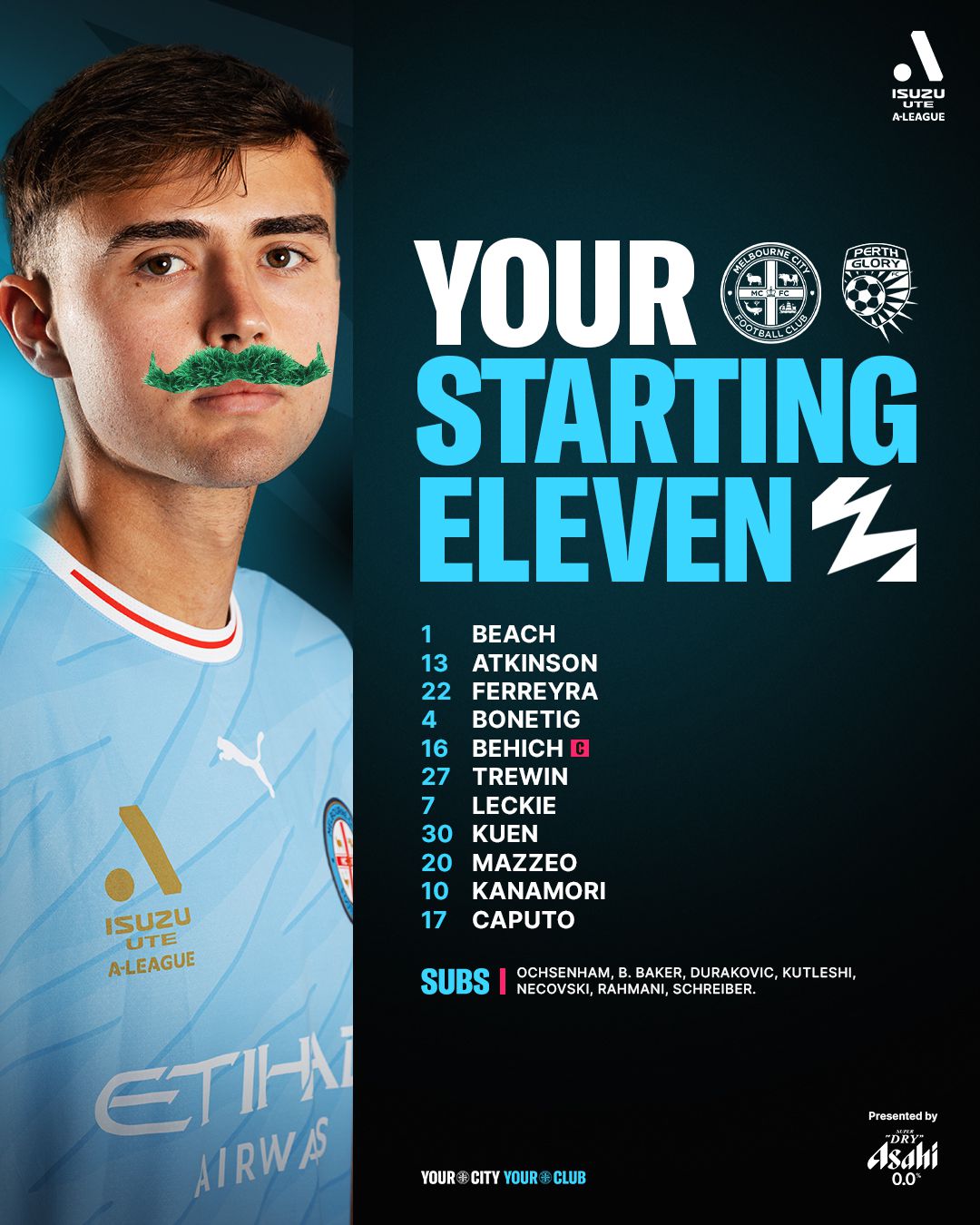 墨尔本城后备队员阵容:33-奥森汉姆、34-内科夫斯基、44-库特勒希、39-杜拉科维奇、19-施赖伯、47-拉赫马尼、38-贝克